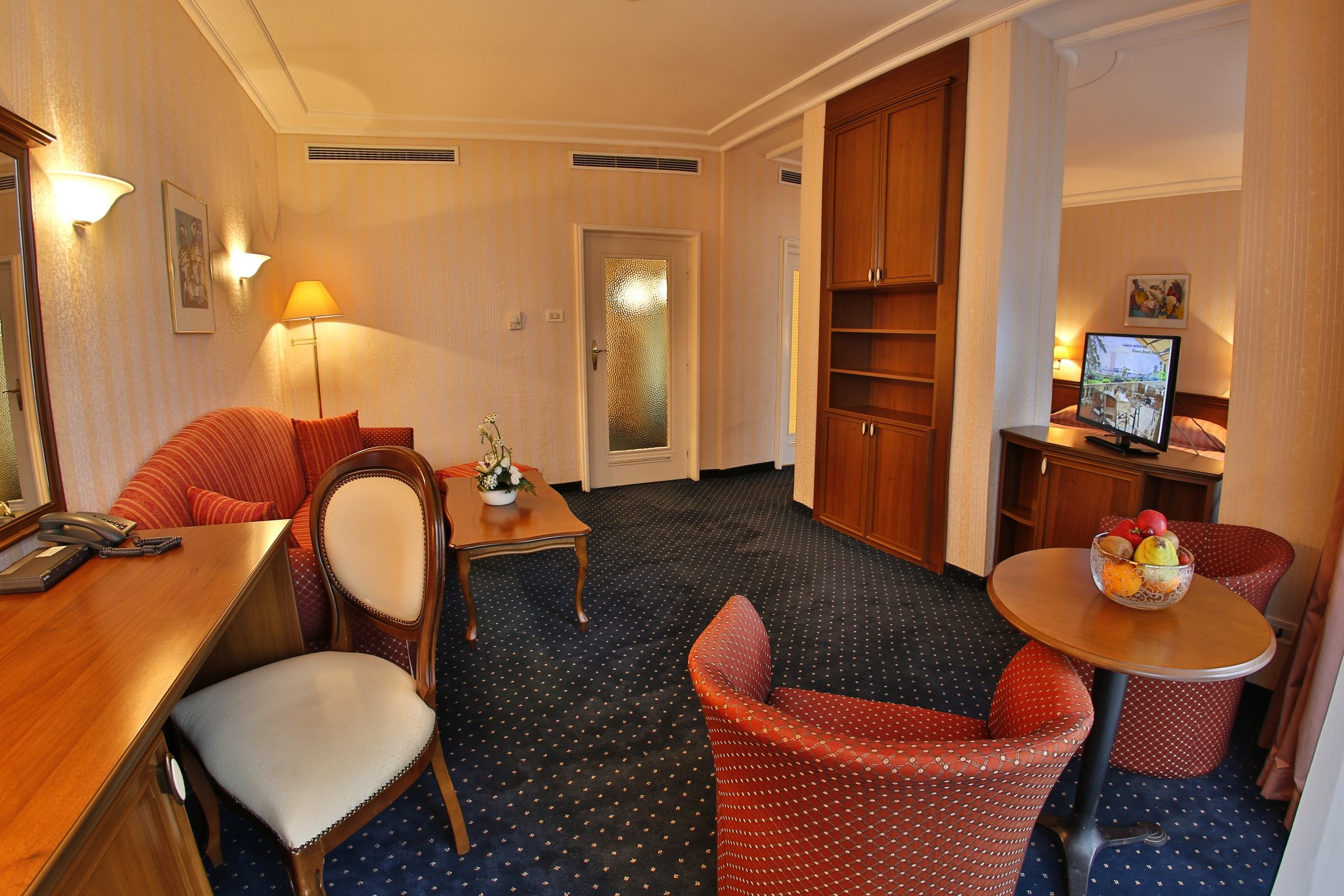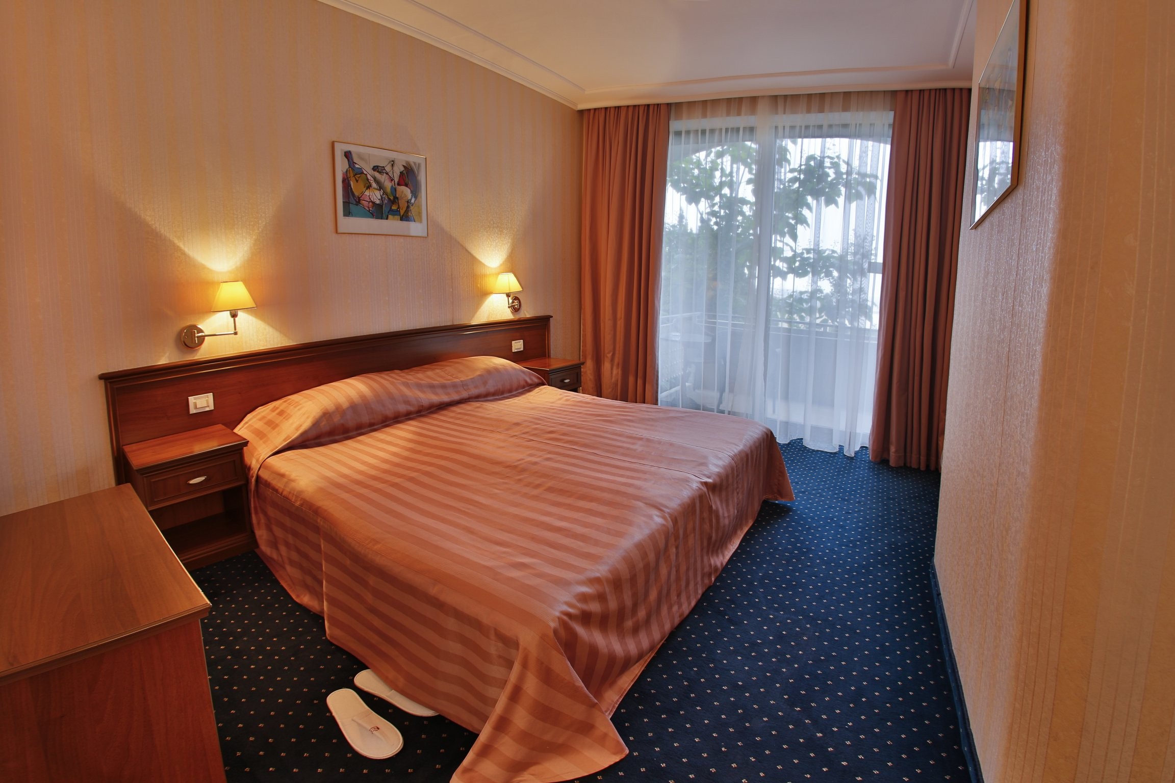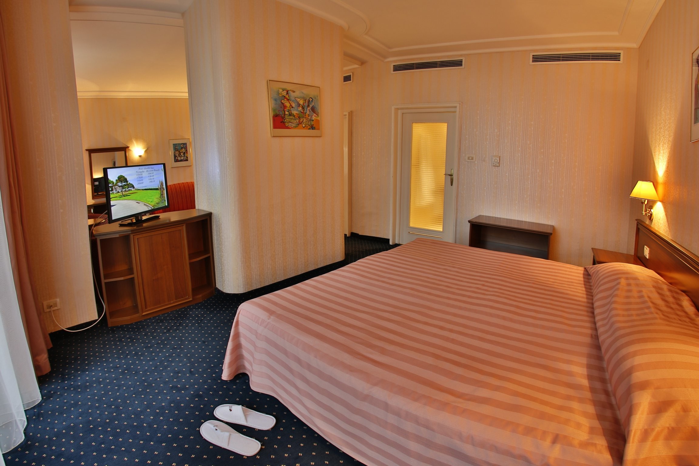 Апартамент джуниор представлява едно помещение със спалня за двама и стена, която визуално го разделя на два къта (спалня и хол).