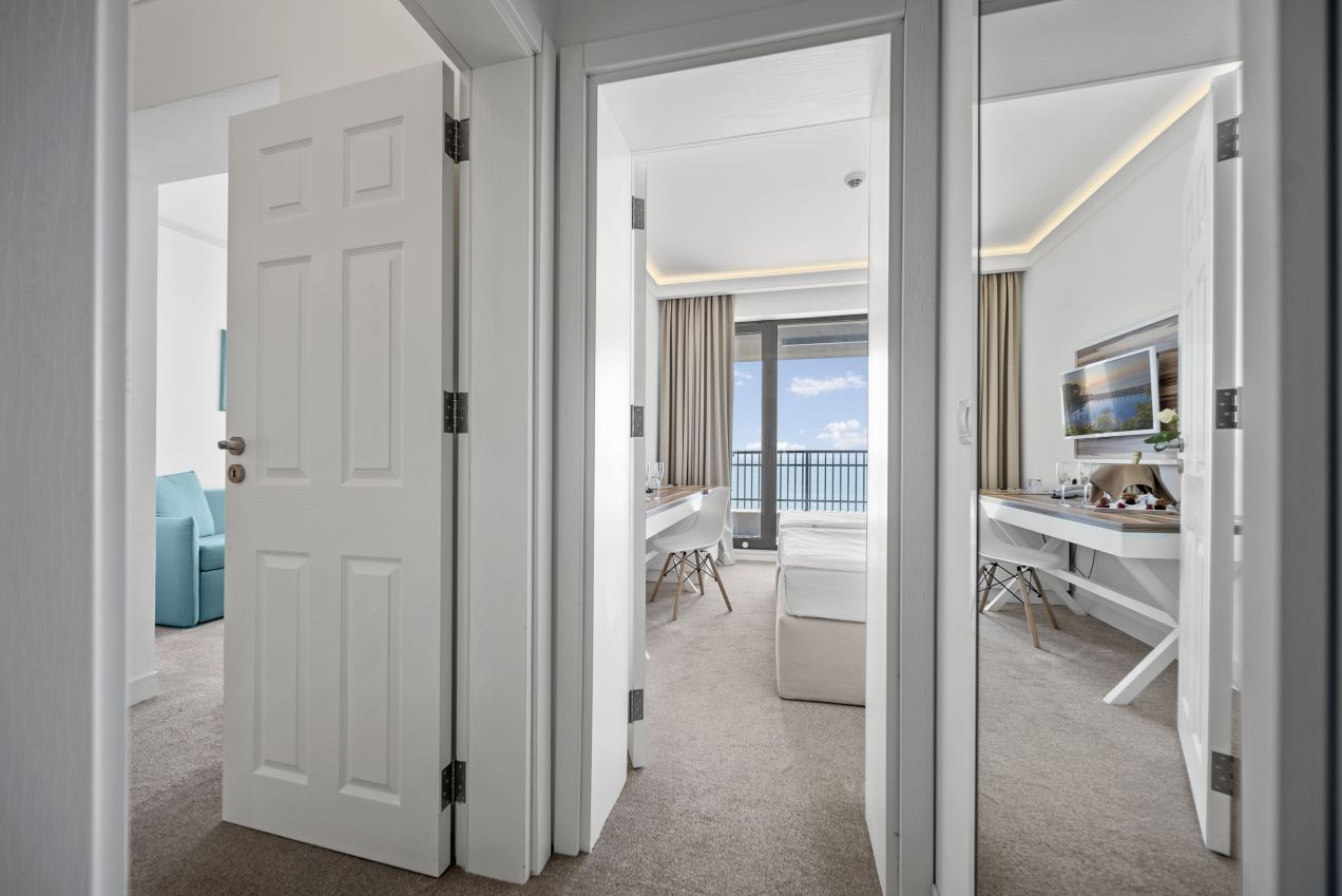 Красиво обзаведен в съвременен стил, двуспалният апартамент е с площ 48 м2 и е подходящ за семейство с 2 деца или 3 възрастни с 1 дете. Разположен на последния четвърти етаж на хотела, проектиран да улови всичките Ви специални летни спомени заедно, апартаментът се състои от всекидневна с мека мебел, една спалня с двойно легло и втора спалня с единично легло. От панорамните прозорци и широката тераса се разкрива удивителна гледка към Черно море.