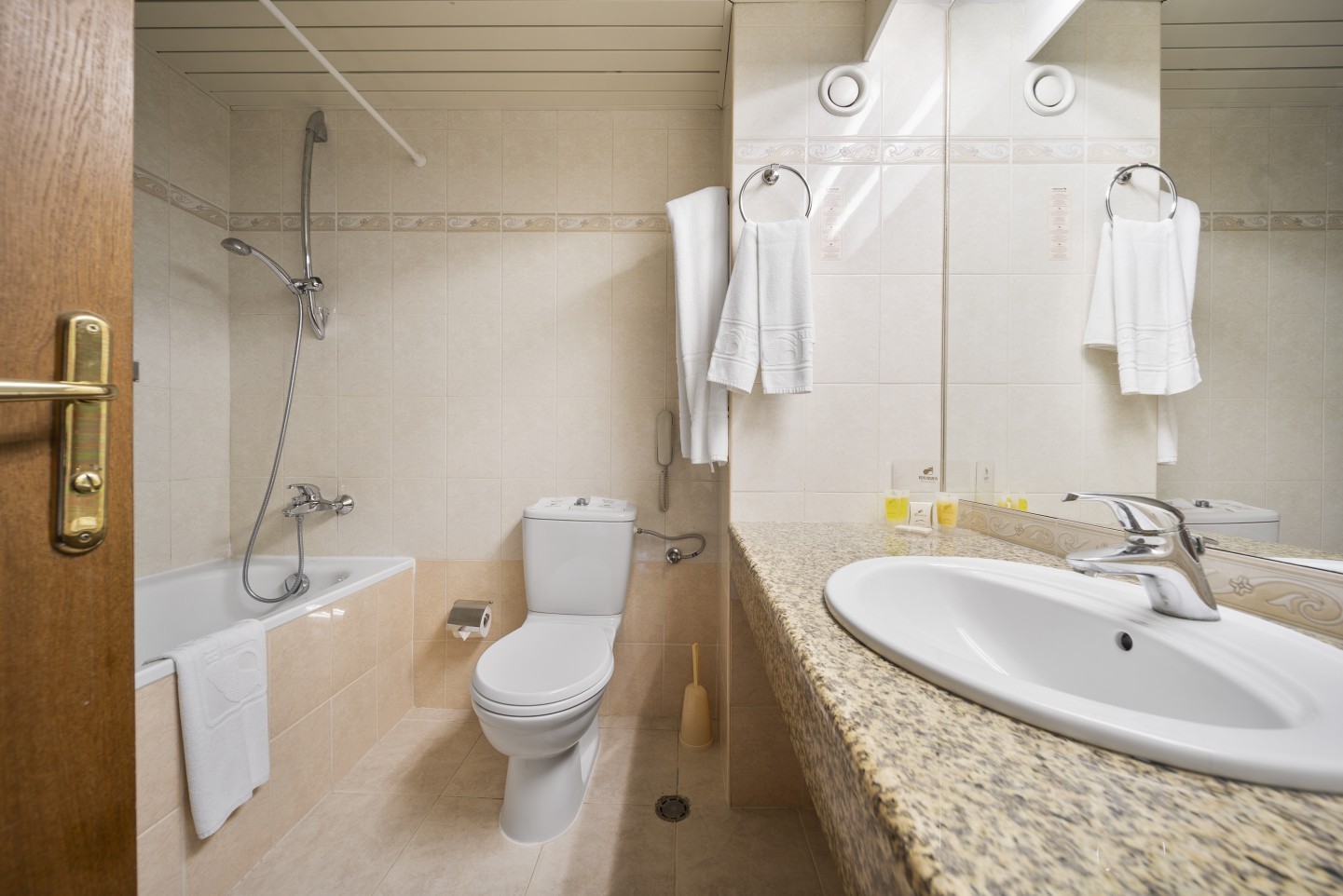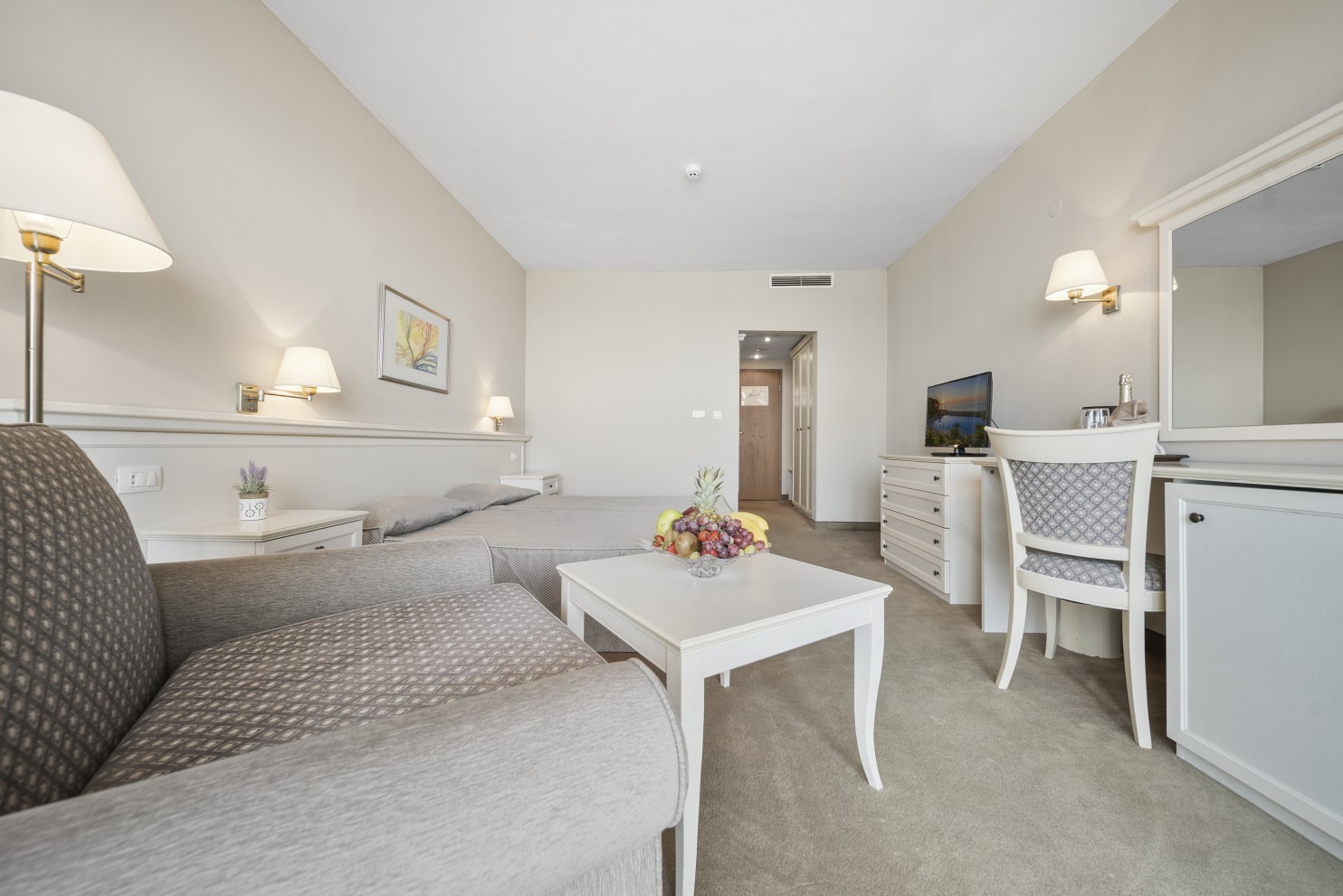 Двойната стая е подходяща за настаняване на двойки или семейства с едно дете. На Ваше разположение ще намерите двойно легло (180x200 см) или две единични легла (90x200 см), собствен балкон и невероятна гледка към морето. Насладете се както на изгрева, така и на залеза. Излезте от стаята си на златния пясъчен плаж и се потопете в сладко безвремие.