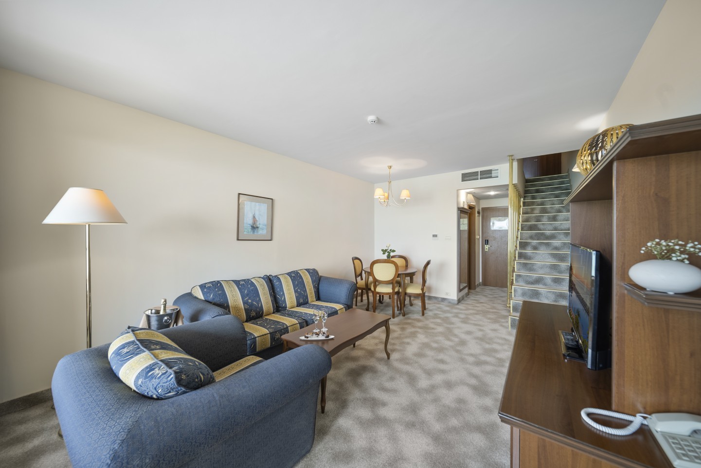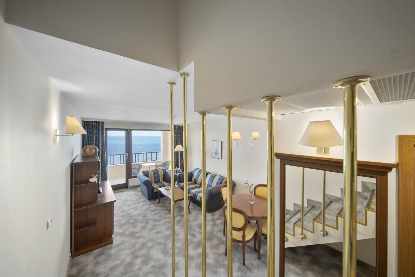 Елегантно обзаведен, модерен и просторен, този мезонет Ви предлага две нива. На първото ниво се намират всекидневна с трапезария и тераса, от която се разкрива просторна панорама към морето и красивия парк. На второто ниво на мезонета е спалнята с двойно легло (180/200 см.) и единично легло (80/200 см.)